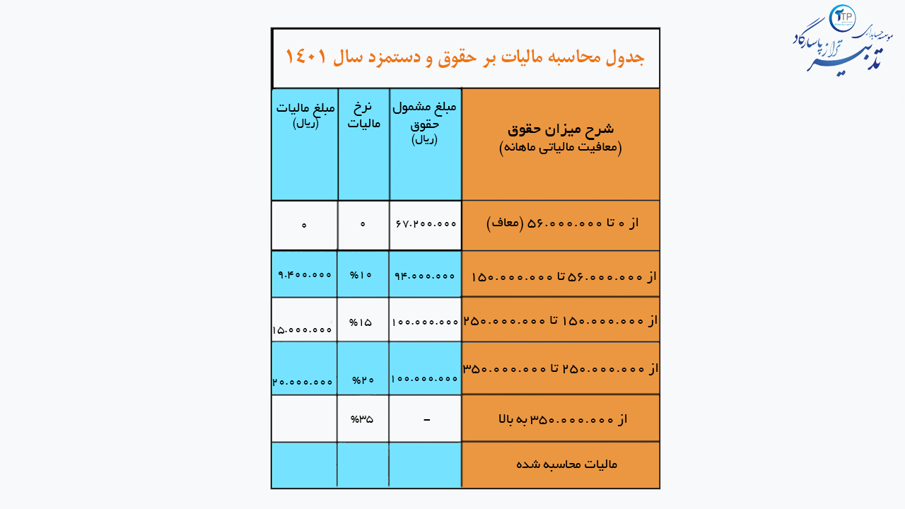 جدول محاسبه مالیات بر حقوق و دستمزد سال 1401