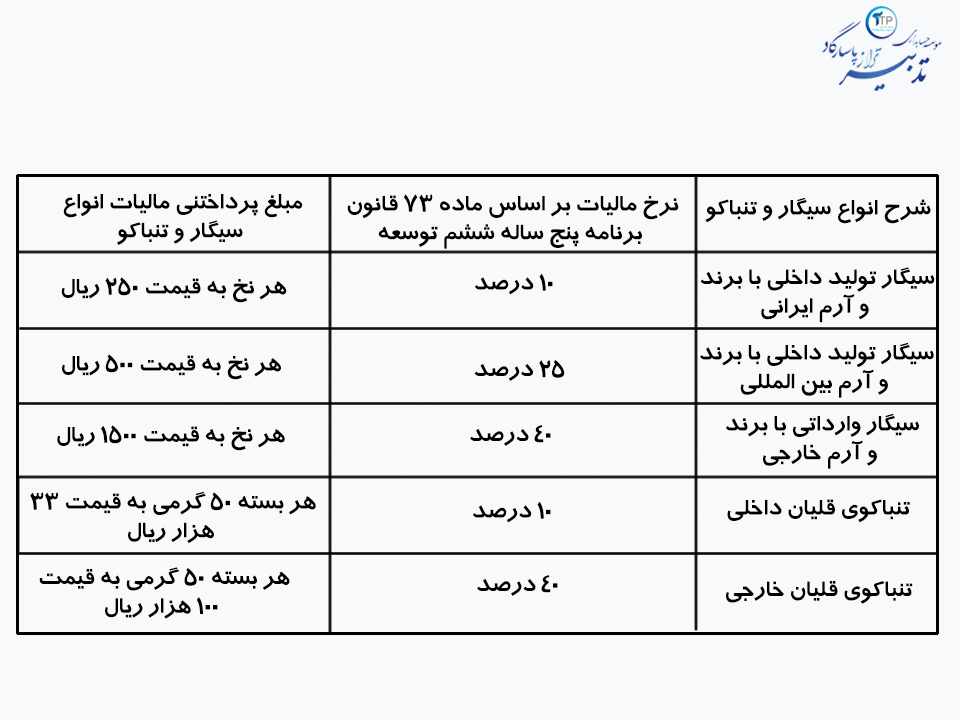 اما به صورت کلی طبق قانون مالیات دخانیات به صورت جدول زیر تعریف می شود:
